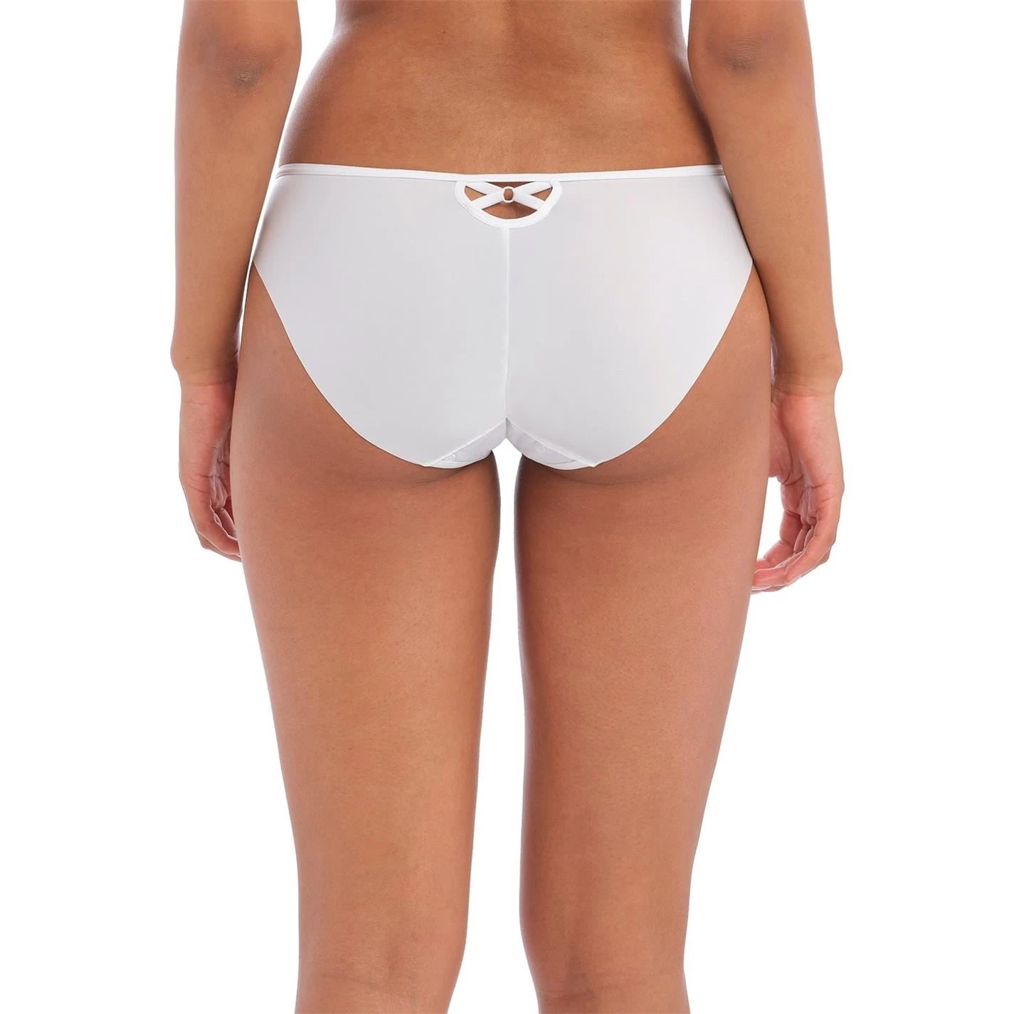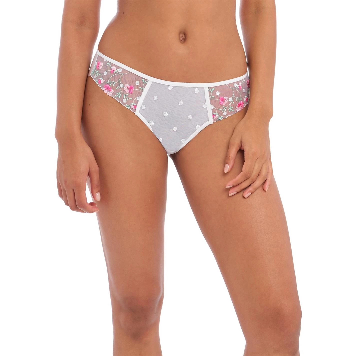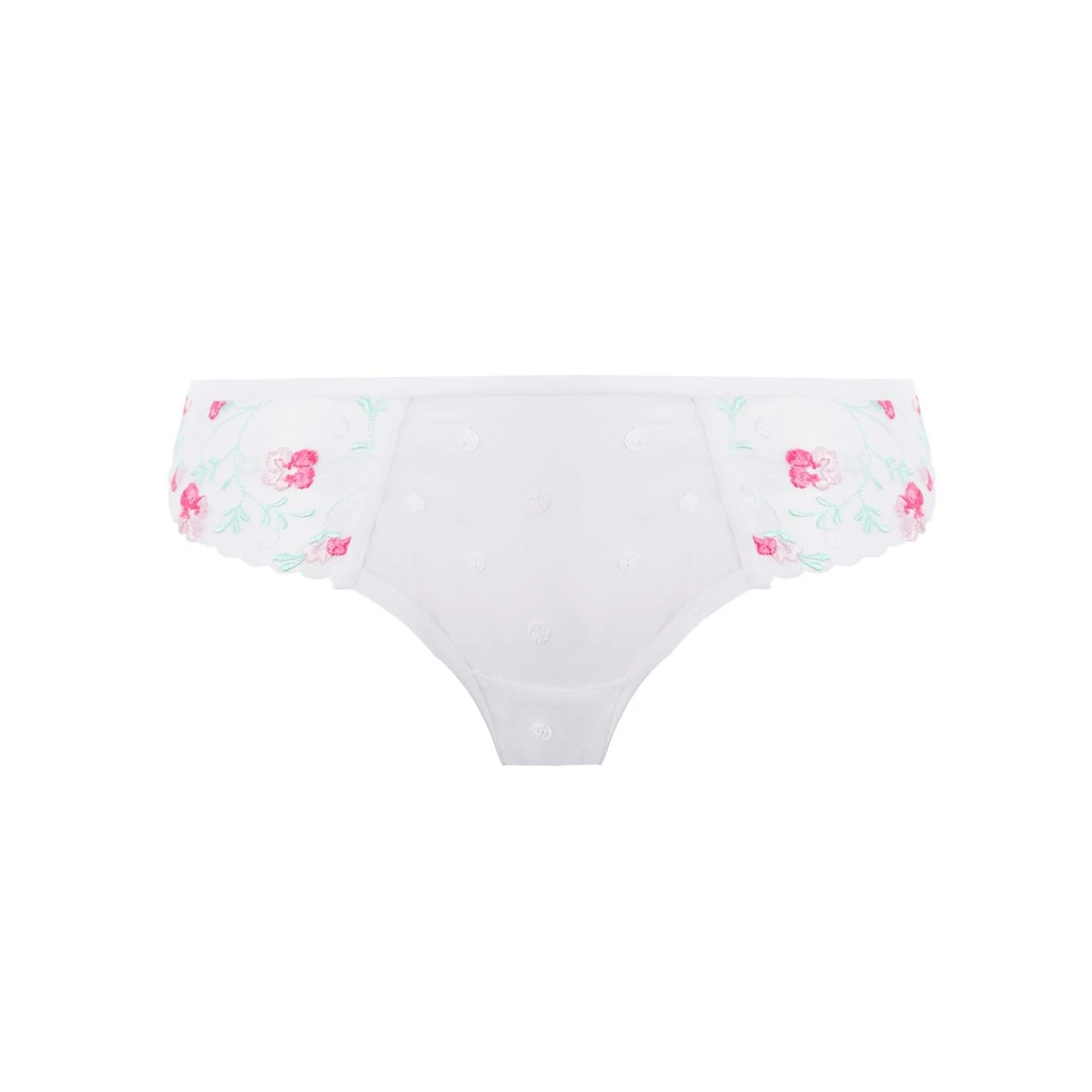 Soft handle clean cut fabric for a second skin feeling and no VPL for minimal show through under clothing. This stretch fabric has an embroidery spot that adorns the front panel, lightly lined for additional modesty. Feminine floral embroidery along the side front leg and a keyhole centre back detail with strapping through a gold ring.