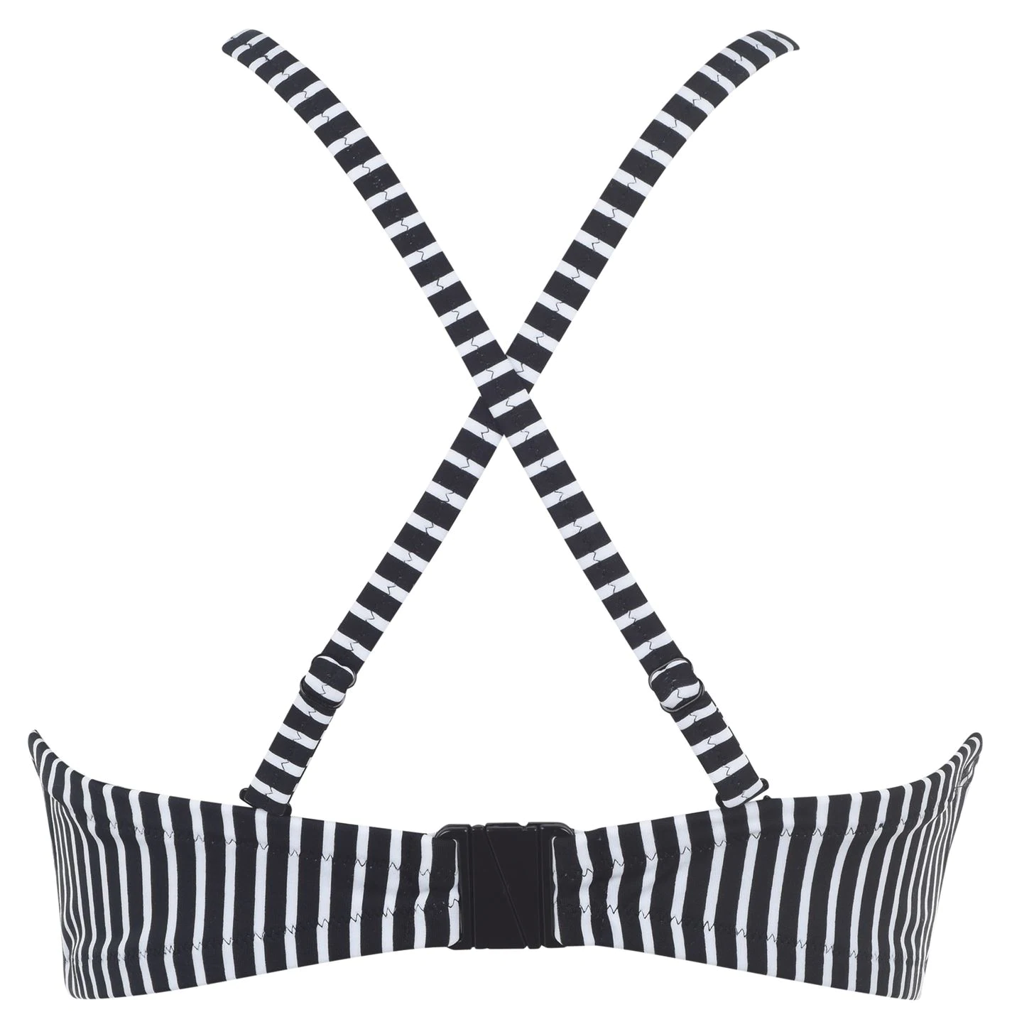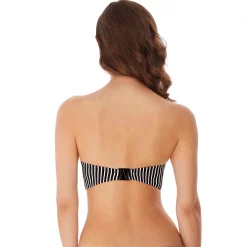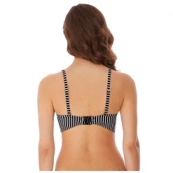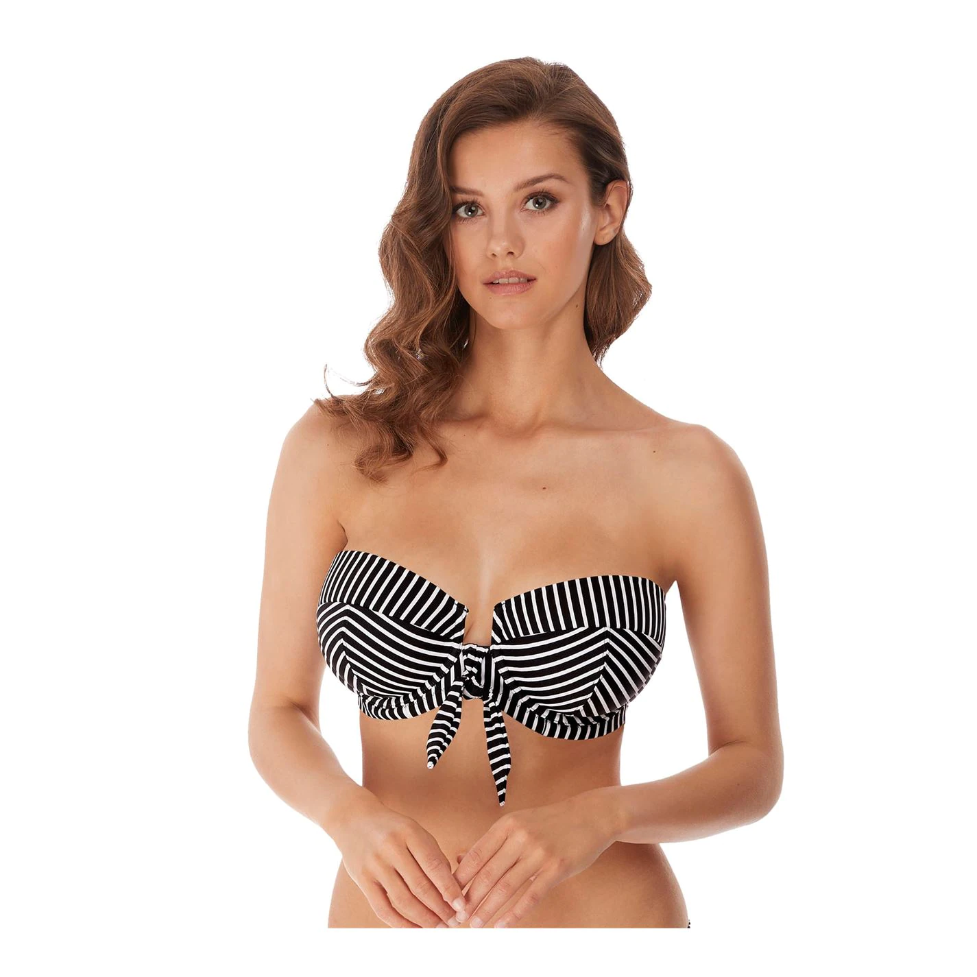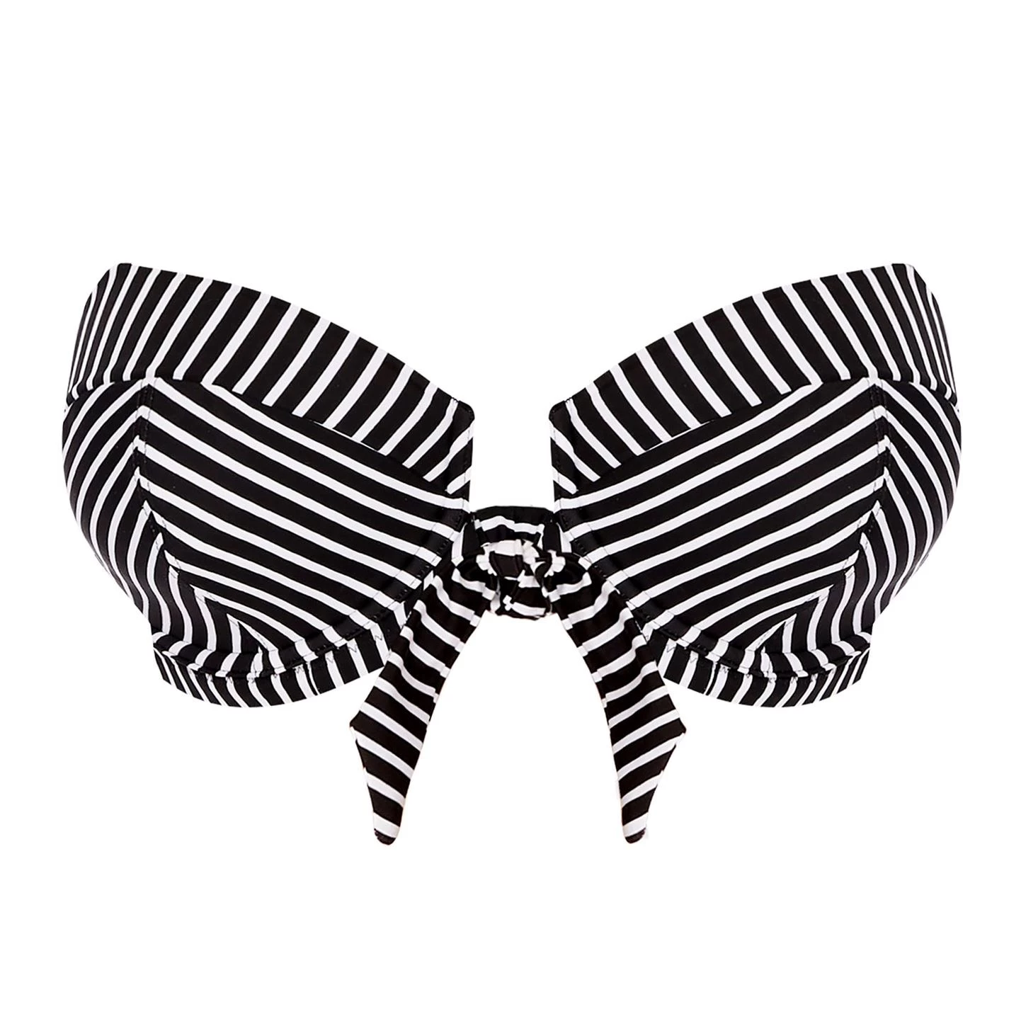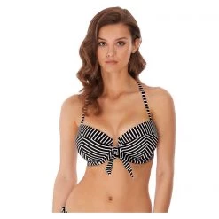 A chevron designed underwired bandeau style with lightly foamed cups for a rounded shape and support. It features an open centre front detail with bunny knot tie as well as detachable, adjustable straps allow this style to be worn as a criss cross, halter or bandeau.