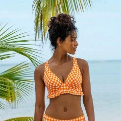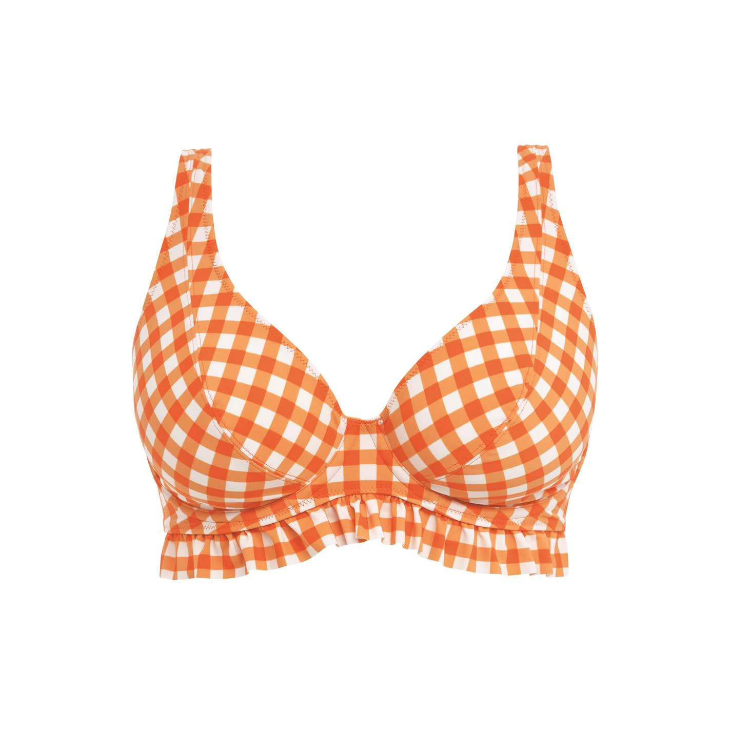Check In collection in a gingham design to give you that on trend retro look. The Underwire High Apex Bikini Top has a sexy low plunging neckline with elongated apex. A free cut frill features along the bottom of cradle, tapering to the clasp. The powernet lined cups offer shaping and support. This style also features a J-hook feature which allows you to convert this into a racerback for versatility of wear. The fabric is made from Xtra Life Lycra, which is more durable and long wearing.