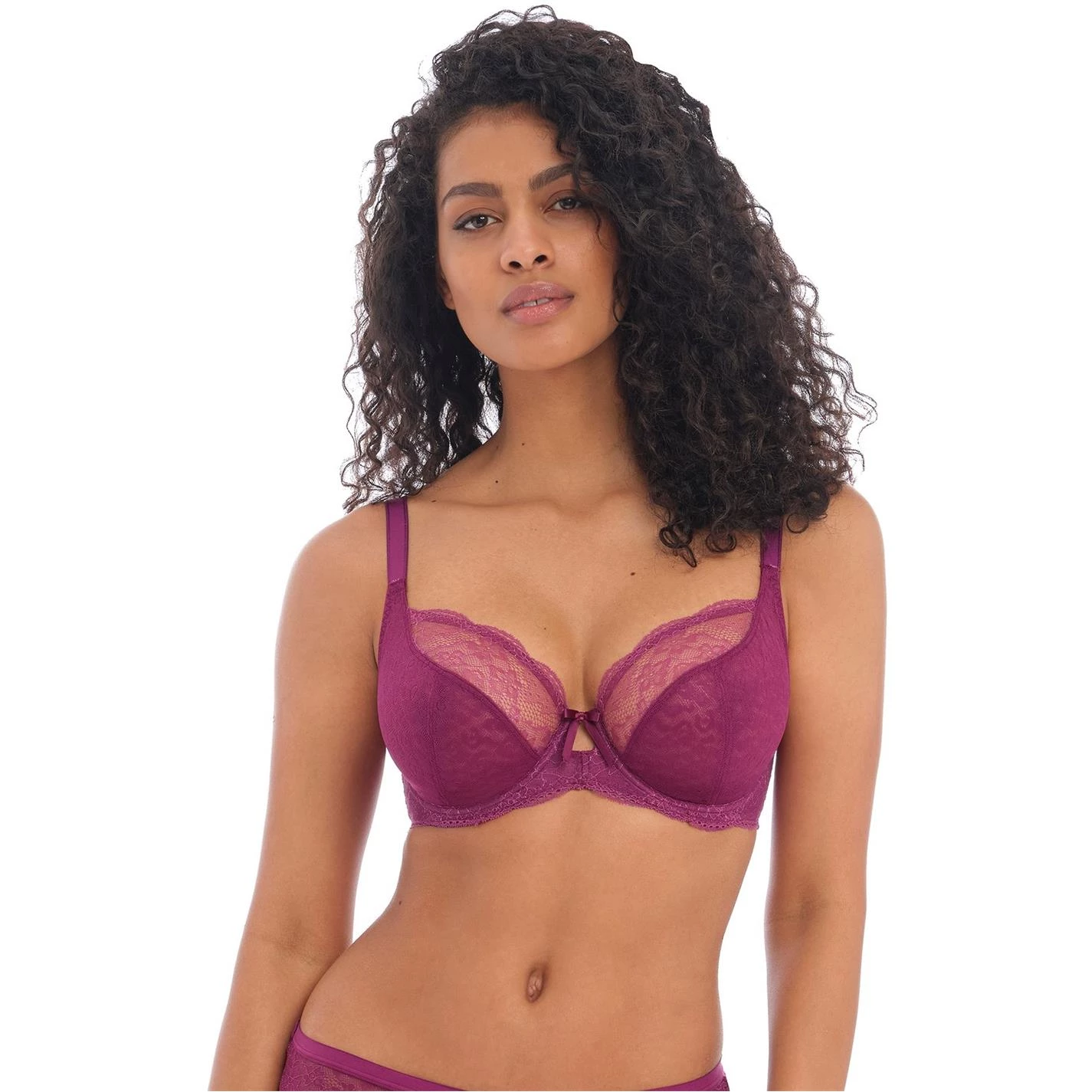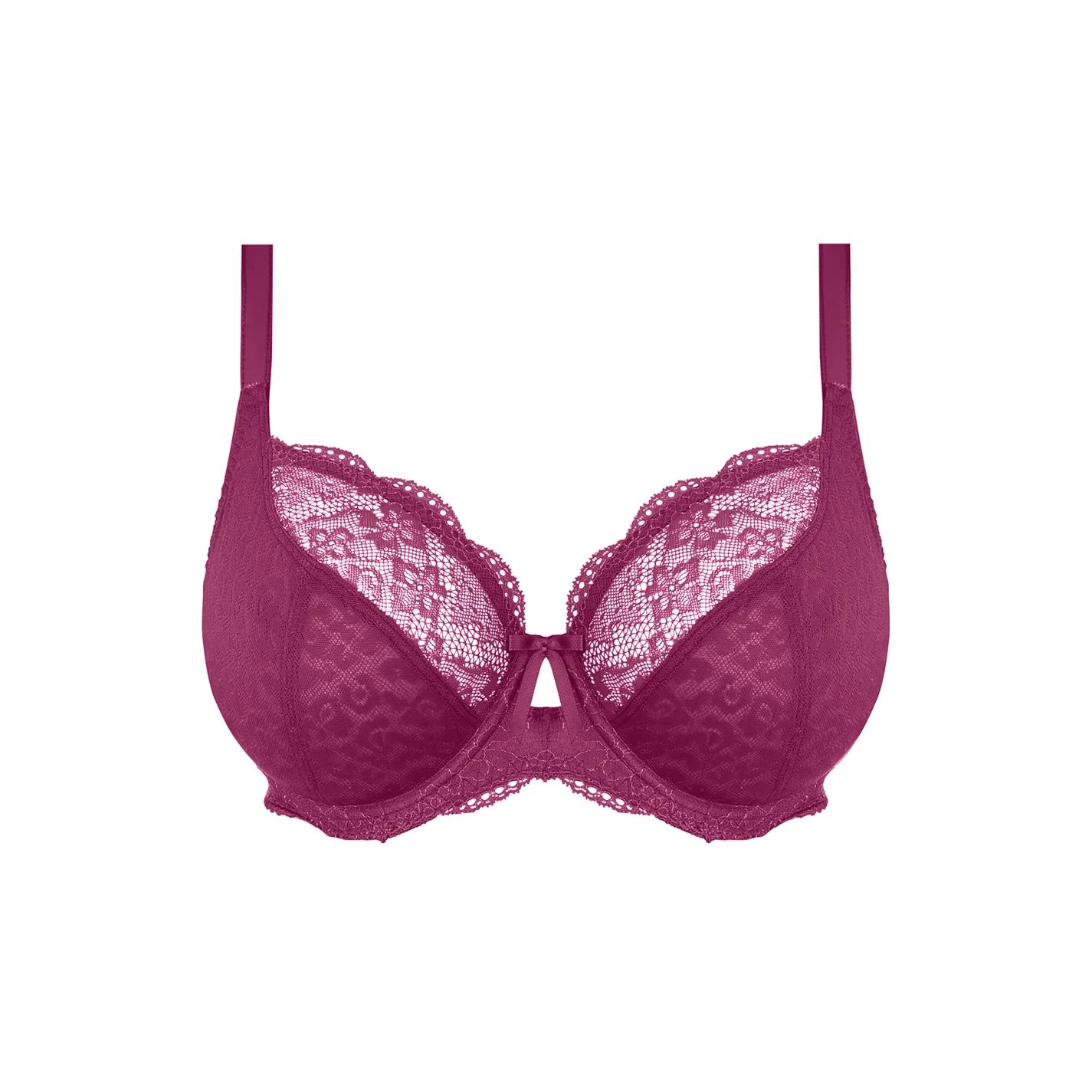 The Freya fancies style extends into a new fashion colourway in a rich berry tone. The all over lace bra has a low centre front for a revealing neckline and a low gated back feature with one hook and eye. The straps are fully adjustable with powernet wings to ensure perfect support in all cup sizes. Also available in other colours.