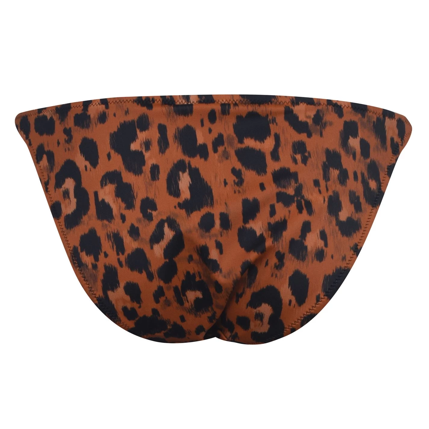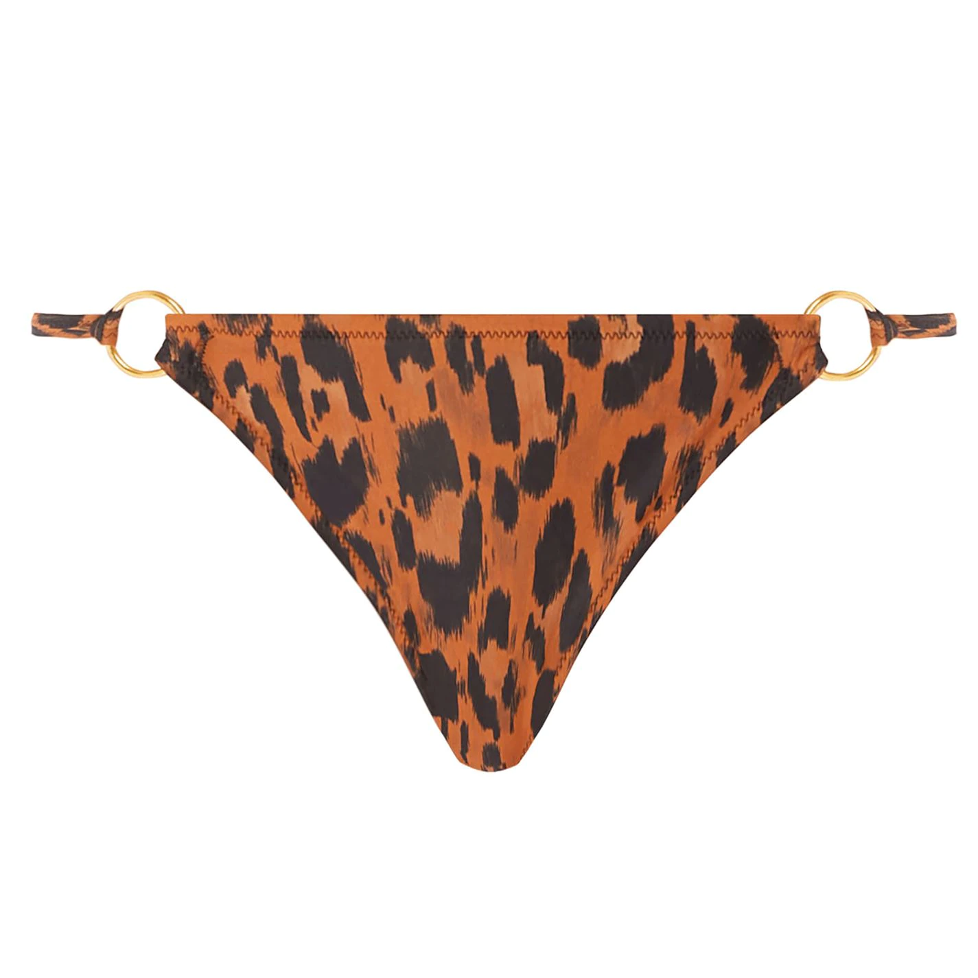 Featuring a burnt amber base with a large scale black animal print is fiercely on trend. Sits low on the hips and offers skimpy bottom coverage. Narrow sides with gold ring detail at the front waist.
