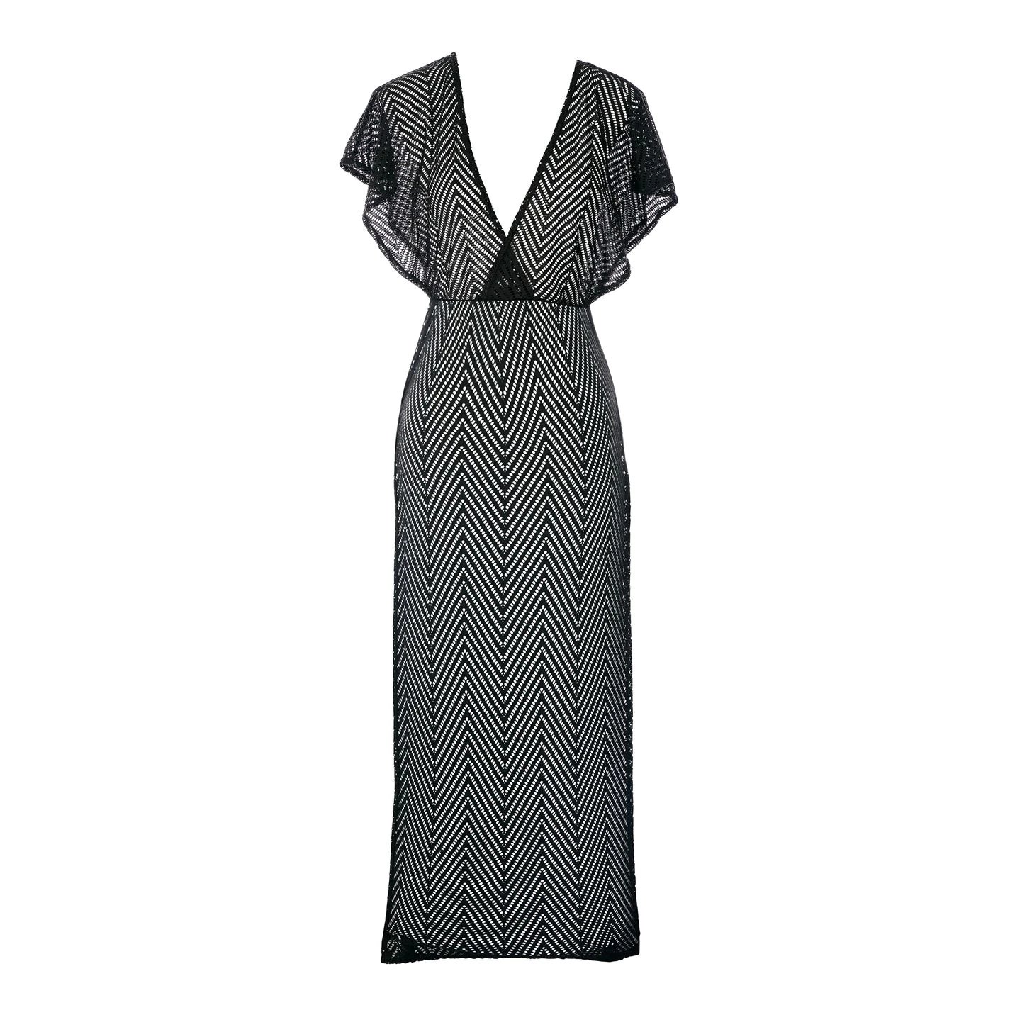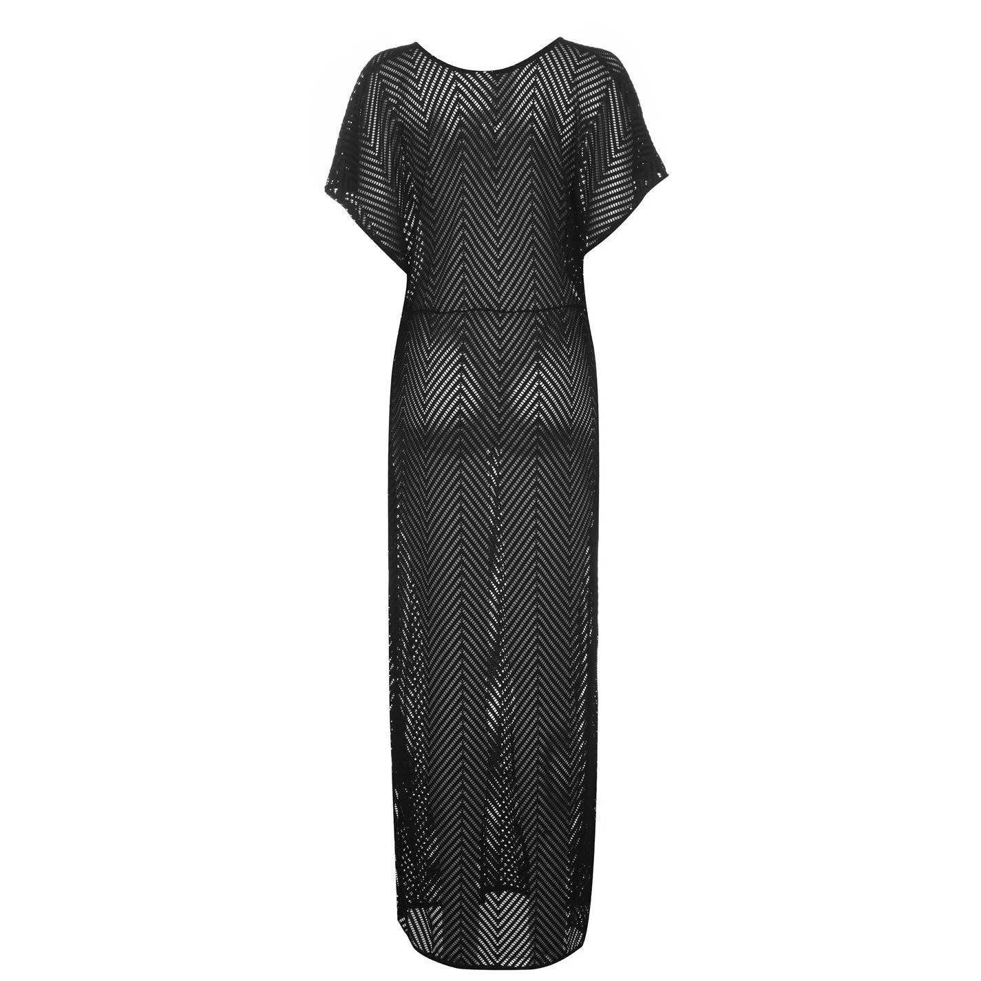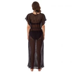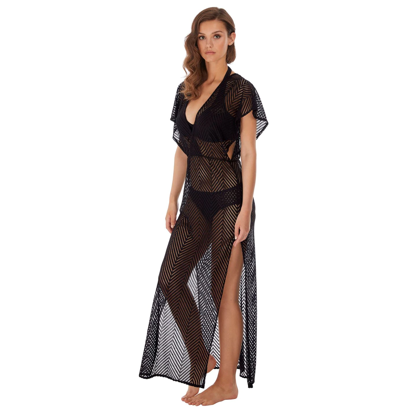 Elevate your poolside style with Urban. This all-Black collection features a subtle chevron crochet texture with sheer panels to create an ultra-flattering high fashion look. Maxi length styling with a sexy deep V-neck with crossover wrap detailing at centre front. Relaxed cap sleeve styling with side splits to mid thigh and an elasticated waist for ease of fit.