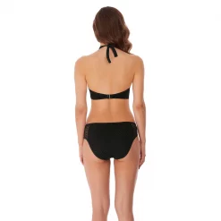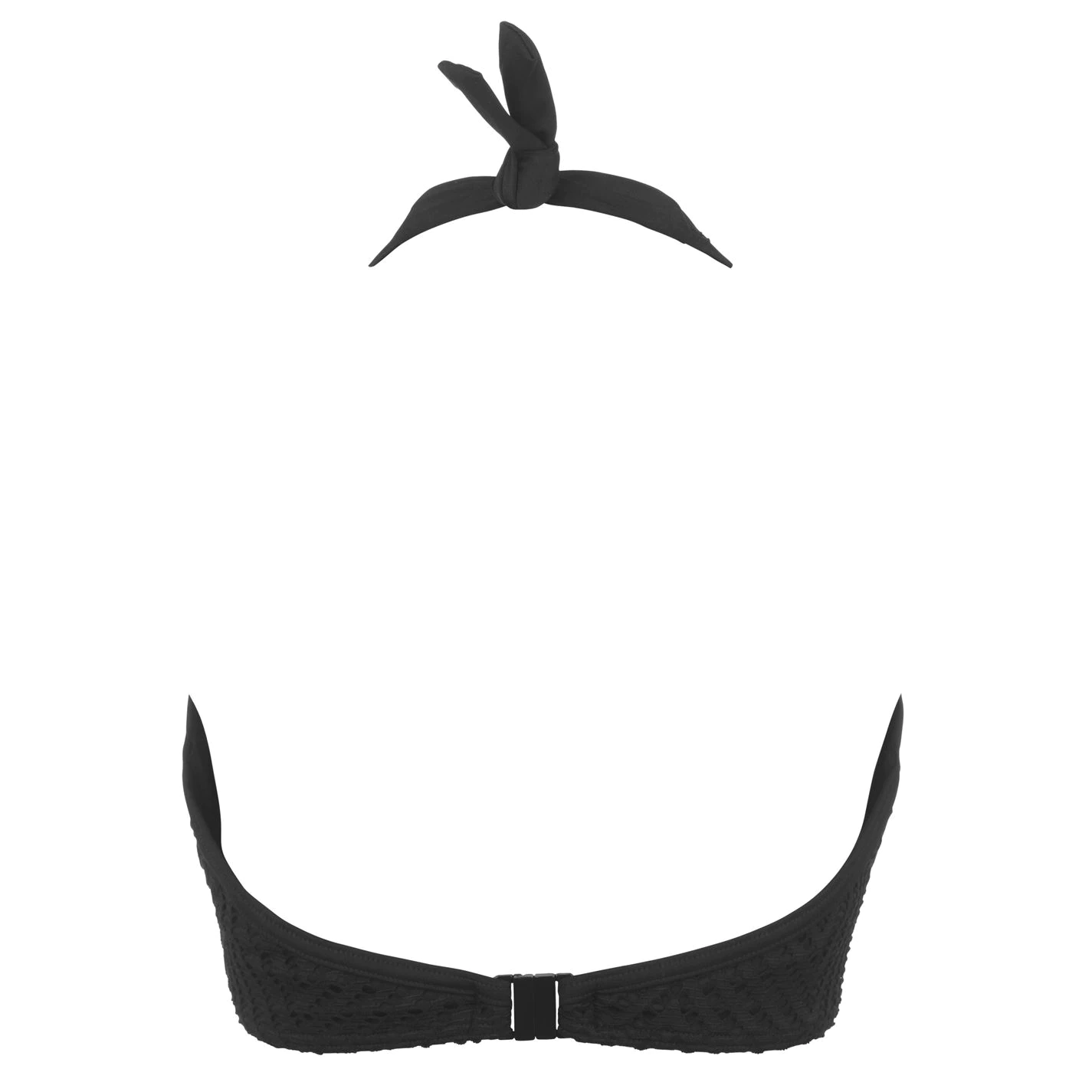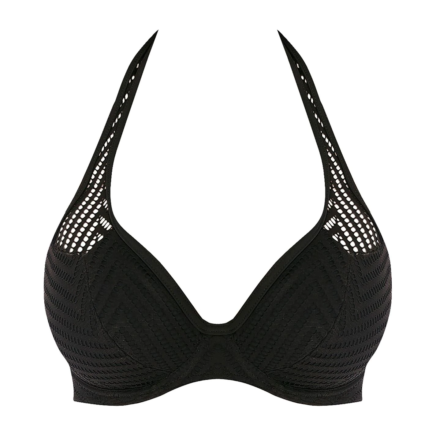 Elevate your poolside style with Urban. This all-Black collection features a subtle chevron crochet texture with sheer panels to create an ultra-flattering high fashion look. Low revealing neckline for less coverage with powernet lined cups for shaping and support and a sheer apex detailing. Fixed halter neck ties.