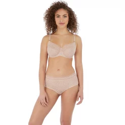 The perfect combination of function and styling in the popular viva style in Freya, which features an iconic frame which has a low centre front, side support and a top cup stretch lace for a comfortable fit that sits flat on the bust. The beautiful geometric lace, is flat and easy to wear under clothes. An everyday essential which is striking but remains functional.