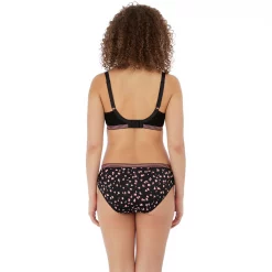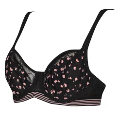 Animal inspired print in a nude tone against a crisp black background. Finished with black top cup lace detail. Three section bottom cup that offers a nice rounded shape and ultimate support.