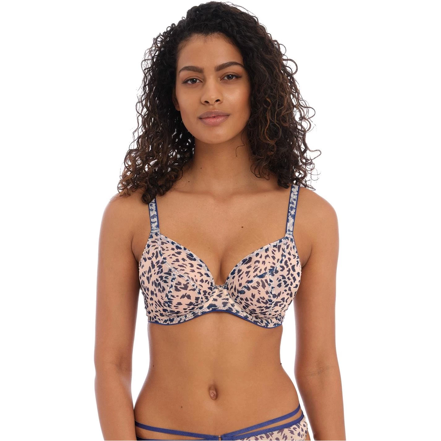 With the an on-trend abstract animal print Wildside features a striking leopard print design on a almond base and cool grey/denim colour palette, with contrast bindings. The Underwire Plunge Bra has a low centre front for a plunging neckline without push up. The deeper wire offers greater coverage and support. This semi-sheer printed fabric offers optimal support and is finished with a decorative stretch elastic at neck edge. The wings are made from a suppportive all over printed mesh and the fixed fully adjustable straps prevent strap slippage. Completed with a silver hexagonal metal detail at the centre front. Matching coordinate available.
